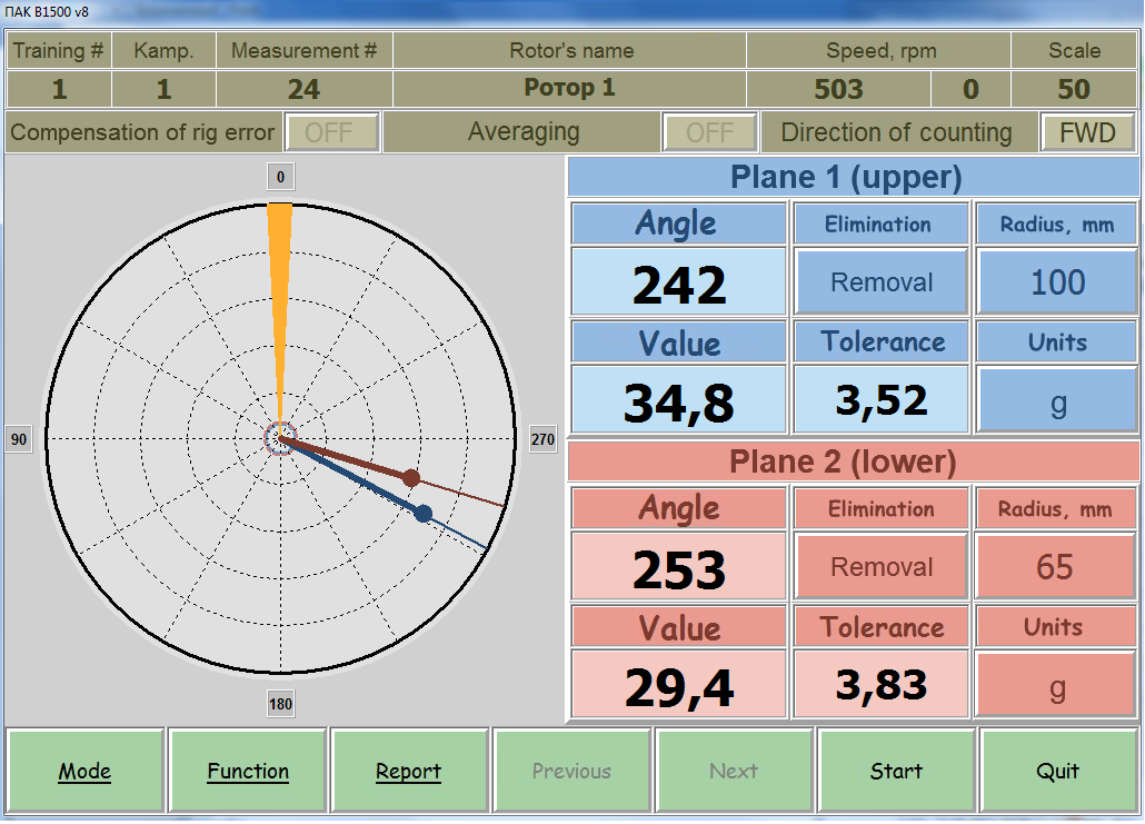 - Echtzeitanzeige von Unwuchtgröße und Winkelposition, einschließlich „Hervorhebung“ der Korrekturzone.
