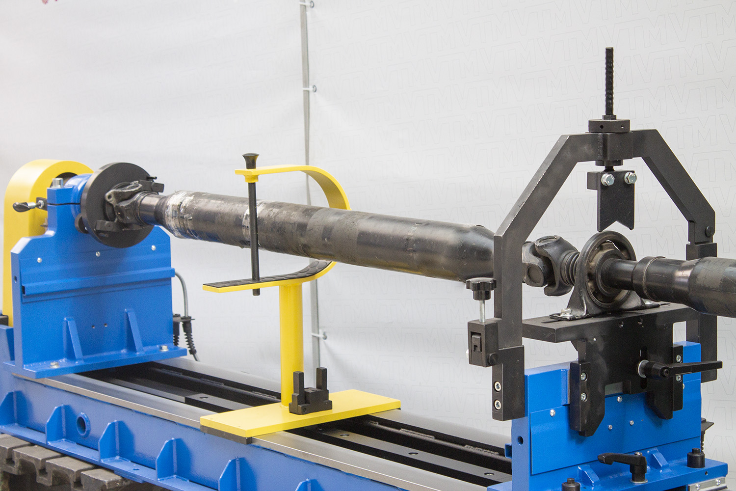 - Roller-guided support movement – Support assemblies move along bed guides using roller systems enabling single-handed positioning. The roller design reduces operator effort while providing smooth, precise support positioning for various driveshaft lengths.